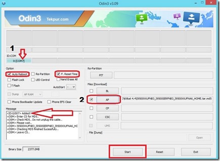 3.Buka Odin 3,dan pastikan perangkat terdeteksi oleh Odin seperti pada gambar di bawah (nomor 1),centang Auto Reboot dan F.Reset Time seperti gambar di bawah